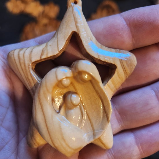 Porta il calore e la tradizione della Terra Santa nella tua casa con questo splendido addobbo a forma di stella, finemente intagliato a mano in pregiato legno d’olivo. Al centro della stella è racchiusa una rappresentazione stilizzata e moderna della Sacra Famiglia, un simbolo intramontabile di amore, pace e unione.