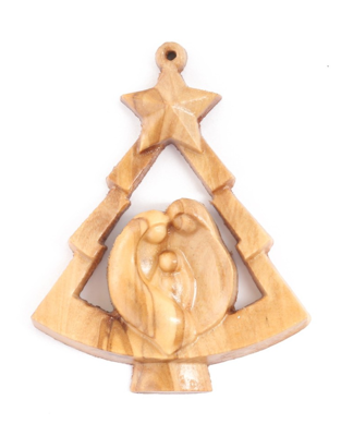Questo originale addobbo fonde i due simboli più amati delle festività: la forma dell’albero di Natale e il cuore pulsante del Presepe. Al centro della sagoma traforata, sormontata da una stella, trova posto una rappresentazione moderna e delicata della Sacra Famiglia, scolpita nel pregiato legno d’olivo.
