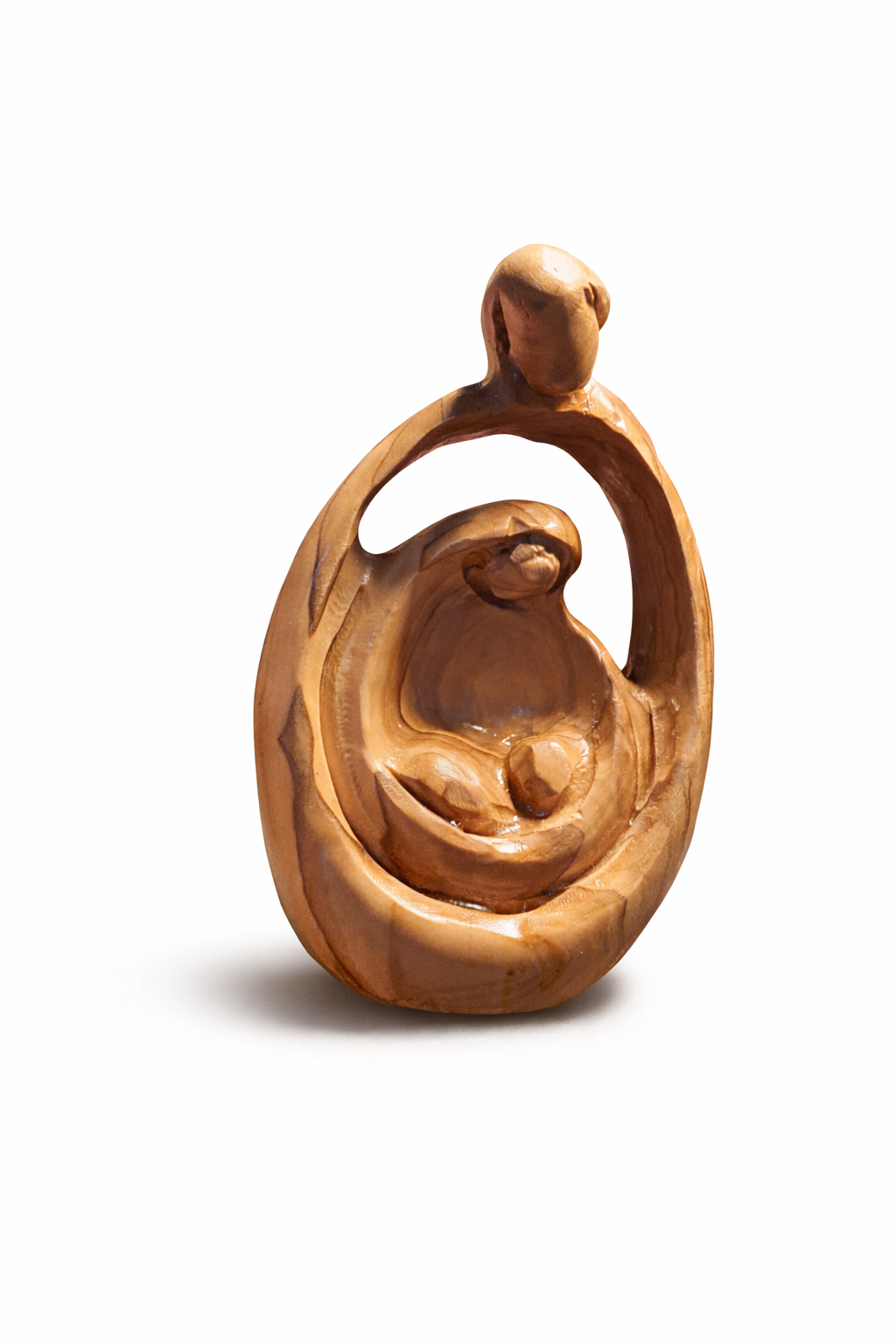 Unicità e Simbolismo: Le venature intense e contrastate, tipiche del legno d’olivo locale, rendono ogni statuina un pezzo unico, simbolo di pace e resilienza.