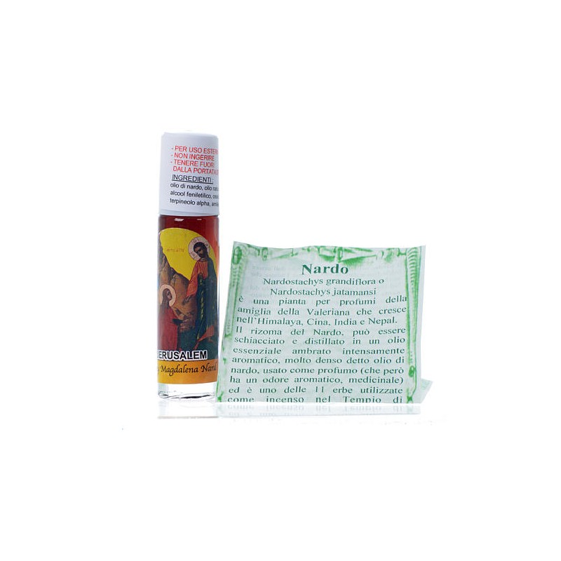 Pregiato olio profumato di Nardo proveniente direttamente da Gerusalemme. Questa essenza biblica, citata nei Vangeli come simbolo di devozione e amore, è estratta dalla pianta Nardostachys jatamansi e offre un aroma ambrato, intenso e spirituale.