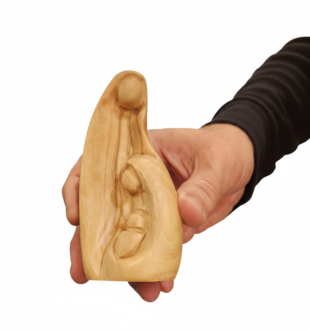 Un Simbolo di Tenerezza e Unità dalla Terra Santa Questa statuina della Sacra Famiglia stilizzata è un capolavoro di essenzialità e calore. Maria, Giuseppe e il Bambino Gesù sono raffigurati in un unico, armonioso blocco di legno d’ulivo autentico, levigato a mano per enfatizzare l’idea di un amore che tutto avvolge e protegge. La sua forma fluida e le linee pulite la rendono un oggetto di design moderno, pur mantenendo un profondo significato spirituale.