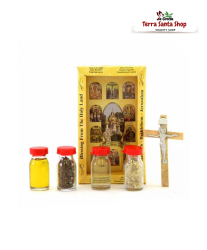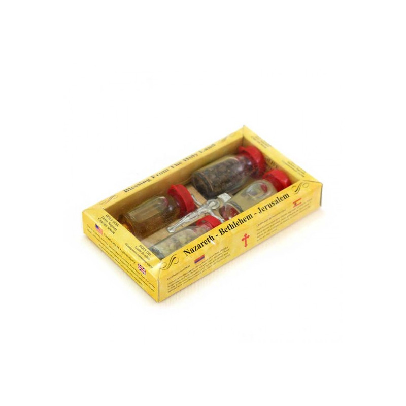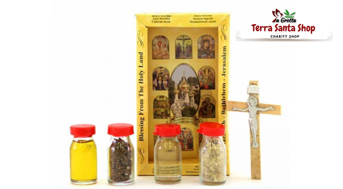 Quattro Ampolle di Reliquie: Piccole bottiglie in vetro contenenti elementi naturali della Terra Santa: Olio d’oliva benedetto, Acqua del Fiume Giordano, Incenso profumato e Terra di Gerusalemme.