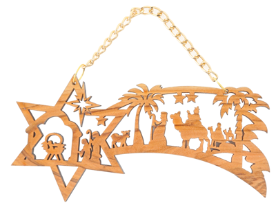 Questa magnifica decorazione a traforo rappresenta il viaggio dei Re Magi verso la Grotta di Betlemme. Realizzata in un unico pezzo di pregiato legno d’olivo, l’opera si sviluppa lungo la coda di una stella cometa, creando una narrazione visiva ricca di dettagli e spiritualità.